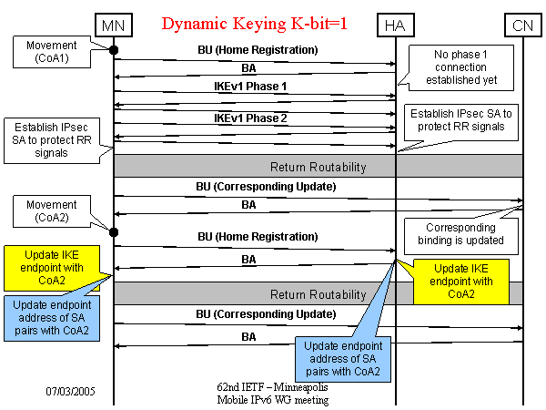 Return Routability Return Routability MN HA CN Establish IPsec SA to protect RR signals Establish IPsec SA to protect RR signals Movement (CoA1) Corresponding binding is updated No phase 1 connection established yet Update IKE endpoint with CoA2 Update IKE endpoint with CoA2 Dynamic Keying K-bit=1 Update endpoint address of SA pairs with CoA2 Update endpoint address of SA pairs with CoA2 |