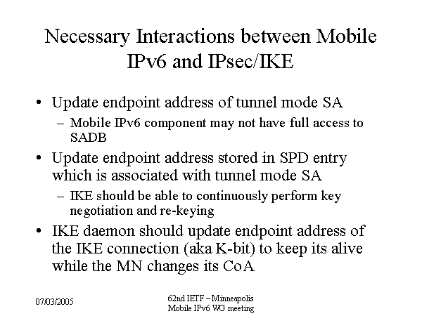 Necessary Interactions between Mobile IPv6 and IPsec/IKE Update endpoint address of tunnel mode SA Mobile IPv6 component may not have full access to SADB Update endpoint address stored in SPD entry which is associated with tunnel mode SA IKE should be able to continuously perform key negotiation and re-keying IKE daemon should update endpoint address of the IKE connection (aka K-bit) to keep its alive while the MN changes its CoA |