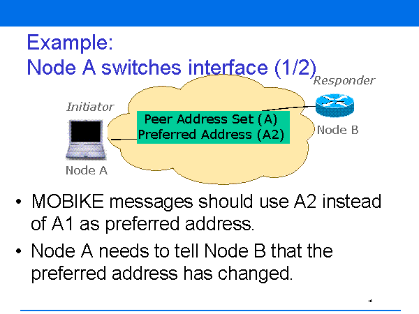 Example: Node A switches interface (1/2) Node A Node B MOBIKE messages should use A2 instead of A1 as preferred address. Node A needs to tell Node B that the preferred address has changed. Initiator Responder Peer Address Set (A) Preferred Address (A2) |