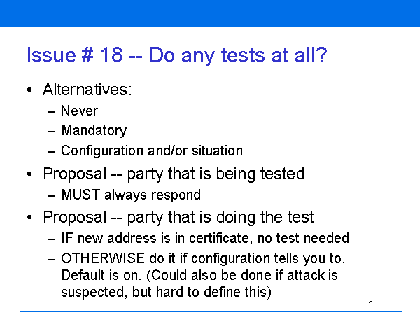 Issue # 18 -- Do any tests at all? Alternatives: Never Mandatory Configuration and/or situation Proposal -- party that is being tested MUST always respond Proposal -- party that is doing the test IF new address is in certificate, no test needed OTHERWISE do it if configuration tells you to. Default is on. (Could also be done if attack is suspected, but hard to define this) |
