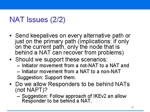 NAT Issues (2/2) Send keepalives on every alternative path or just on the primary path (implications: if only on the current path, only the node that is behind a NAT can recover from problems) Should we support these scenarios: Initiator movement from a not-NAT to a NAT and Initiator movement from a NAT to a non-NAT Suggestion: Support them. Do we allow Responders to be behind NATs (not NAPT)? Suggestion: Follow approach of IKEv2 an allow Responder to be behind a NAT. |