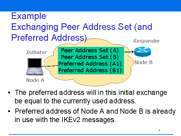 ExampleExchanging Peer Address Set (and Preferred Address) Node A Node B The preferred address will in this initial exchange be equal to the currently used address. Preferred address of Node A and Node B is already in use with the IKEv2 messages. Initiator Responder Peer Address Set (A) Peer Address Set (B) Preferred Address (A1) Preferred Address (B1) |