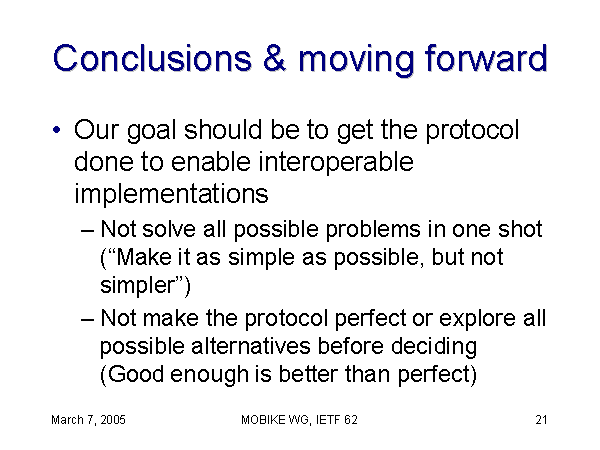 Conclusions & moving forward Our goal should be to get the protocol done to enable interoperable implementations Not solve all possible problems in one shot(“Make it as simple as possible, but not simpler”) Not make the protocol perfect or explore all possible alternatives before deciding(Good enough is better than perfect) |