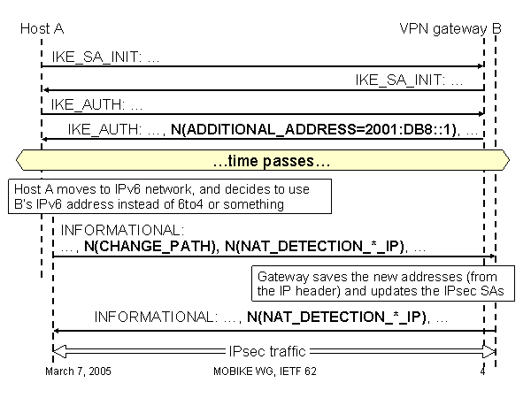 IKE_SA_INIT: … INFORMATIONAL: …, N(NAT_DETECTION_*_IP), … IKE_SA_INIT: … INFORMATIONAL:…, N(CHANGE_PATH), N(NAT_DETECTION_*_IP), … Host A IKE_AUTH: … IKE_AUTH: …, N(ADDITIONAL_ADDRESS=2001:DB8::1), … VPN gateway B Host A moves to IPv6 network, and decides to use B’s IPv6 address instead of 6to4 or something …time passes… Gateway saves the new addresses (from the IP header) and updates the IPsec SAs IPsec traffic |