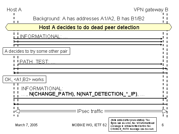 INFORMATIONAL:…, N(CHANGE_PATH), N(NAT_DETECTION_*_IP), … Host A Background: A has addresses A1/A2, B has B1/B2 VPN gateway B INFORMATIONAL: … A decides to try some other pair PATH_TEST: … OK, IPsec traffic Host A decides to do dead peer detection (Note added after presentation) The figure has an error, the 1st informational exchange is retransmitted before the CHANGE_PATH message can be sent. |