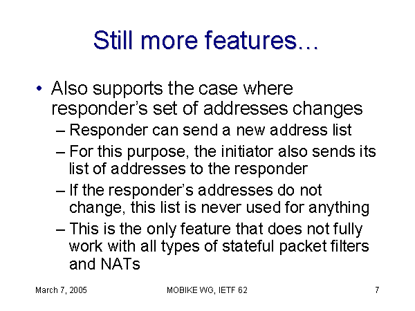 Still more features… Also supports the case where responder’s set of addresses changes Responder can send a new address list For this purpose, the initiator also sends its list of addresses to the responder If the responder’s addresses do not change, this list is never used for anything This is the only feature that does not fully work with all types of stateful packet filters and NATs |