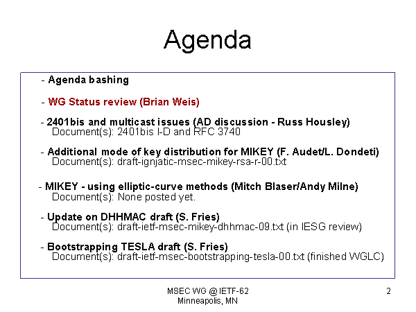 Agenda - Agenda bashing - WG Status review (Brian Weis) - 2401bis and multicast issues (AD discussion - Russ Housley) Document(s): 2401bis I-D and RFC 3740 - Additional mode of key distribution for MIKEY (F. Audet/L. Dondeti) Document(s): draft-ignjatic-msec-mikey-rsa-r-00.txt - MIKEY - using elliptic-curve methods (Mitch Blaser/Andy Milne) Document(s): None posted yet. - Update on DHHMAC draft (S. Fries) Document(s): draft-ietf-msec-mikey-dhhmac-09.txt (in IESG review) - Bootstrapping TESLA draft (S. Fries) Document(s): draft-ietf-msec-bootstrapping-tesla-00.txt (finished WGLC) |