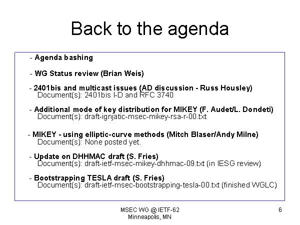 Back to the agenda - Agenda bashing - WG Status review (Brian Weis) - 2401bis and multicast issues (AD discussion - Russ Housley) Document(s): 2401bis I-D and RFC 3740 - Additional mode of key distribution for MIKEY (F. Audet/L. Dondeti) Document(s): draft-ignjatic-msec-mikey-rsa-r-00.txt - MIKEY - using elliptic-curve methods (Mitch Blaser/Andy Milne) Document(s): None posted yet. - Update on DHHMAC draft (S. Fries) Document(s): draft-ietf-msec-mikey-dhhmac-09.txt (in IESG review) - Bootstrapping TESLA draft (S. Fries) Document(s): draft-ietf-msec-bootstrapping-tesla-00.txt (finished WGLC) |