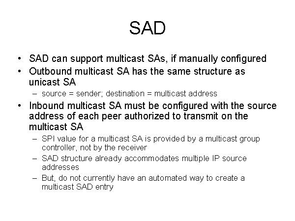 SAD SAD can support multicast SAs, if manually configured Outbound multicast SA has the same structure as unicast SA source = sender; destination = multicast address Inbound multicast SA must be configured with the source address of each peer authorized to transmit on the multicast SA SPI value for a multicast SA is provided by a multicast group controller, not by the receiver SAD structure already accommodates multiple IP source addresses But, do not currently have an automated way to create a multicast SAD entry |
