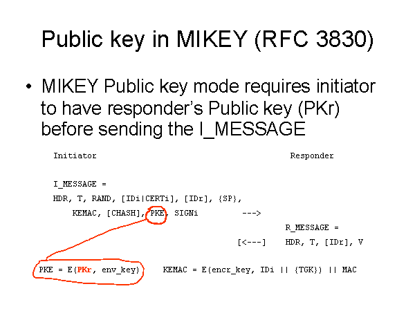 Public key in MIKEY (RFC 3830) MIKEY Public key mode requires initiator to have responder’s Public key (PKr) before sending the I_MESSAGE Initiator Responder I_MESSAGE = HDR, T, RAND, [IDi|CERTi], [IDr], {SP}, KEMAC, [CHASH], PKE, SIGNi ---> R_MESSAGE = [<---] HDR, T, [IDr], V PKE = E(PKr, env_key) KEMAC = E(encr_key, IDi || {TGK}) || MAC |