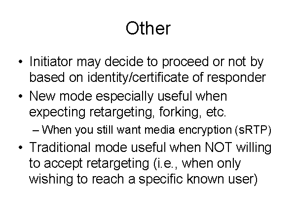 Other Initiator may decide to proceed or not by based on identity/certificate of responder New mode especially useful when expecting retargeting, forking, etc. When you still want media encryption (sRTP) Traditional mode useful when NOT willing to accept retargeting (i.e., when only wishing to reach a specific known user) |