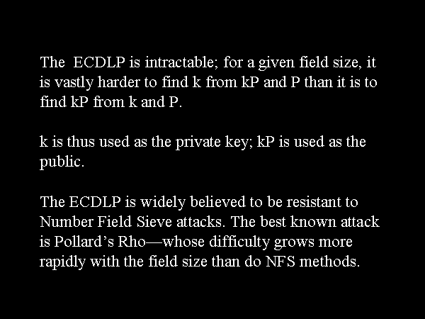 The ECDLP is intractable; for a given field size, it is vastly harder to find k from kP and P than it is to find kP from k and P.k is thus used as the private key; kP is used as the public.The ECDLP is widely believed to be resistant to Number Field Sieve attacks. The best known attack is Pollard’s Rho—whose difficulty grows more rapidly with the field size than do NFS methods. |