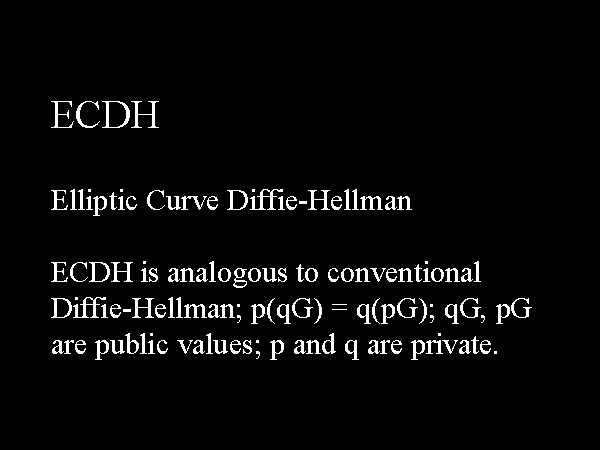 ECDHElliptic Curve Diffie-HellmanECDH is analogous to conventional Diffie-Hellman; p(qG) = q(pG); qG, pG are public values; p and q are private.