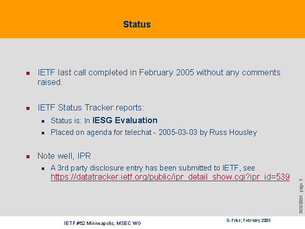 Status IETF last call completed in February 2005 without any comments raised. IETF Status Tracker reports: Status is: In IESG Evaluation Placed on agenda for telechat - 2005-03-03 by Russ Housley Note well, IPR A 3rd party disclosure entry has been submitted to IETF, see https://datatracker.ietf.org/public/ipr_detail_show.cgi?ipr_id=539 |