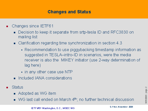 Changes and Status Changes since IETF61 Decision to keep it separate from srtp-tesla ID and RFC3830 on mailing list Clarification regarding time synchronization in section 4.3 Recommendation to use piggybacking timestamp information as suggested in TESLA–intro-ID in scenarios, were the media receiver is also the MIKEY initiator (use 2-way determination of lag here) in any other case use NTP Included IANA considerations Status Adopted as WG item WG last call ended on March 4th; no further technical discussion |