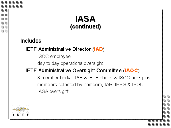 IASA(continued) Includes IETF Administrative Director (IAD) ISOC employee day to day operations oversight IETF Administrative Oversight Committee (IAOC) 8-member body - IAB & IETF chairs & ISOC prez plus members selected by nomcom, IAB, IESG & ISOC IASA oversight |