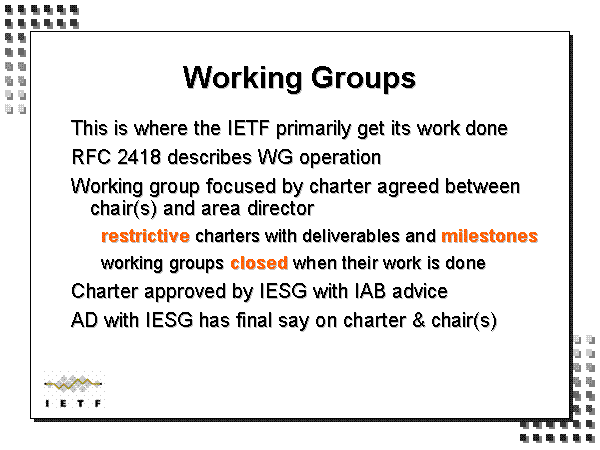 Working Groups This is where the IETF primarily get its work done RFC 2418 describes WG operation Working group focused by charter agreed between chair(s) and area director restrictive charters with deliverables and milestones working groups closed when their work is done Charter approved by IESG with IAB advice AD with IESG has final say on charter & chair(s) |