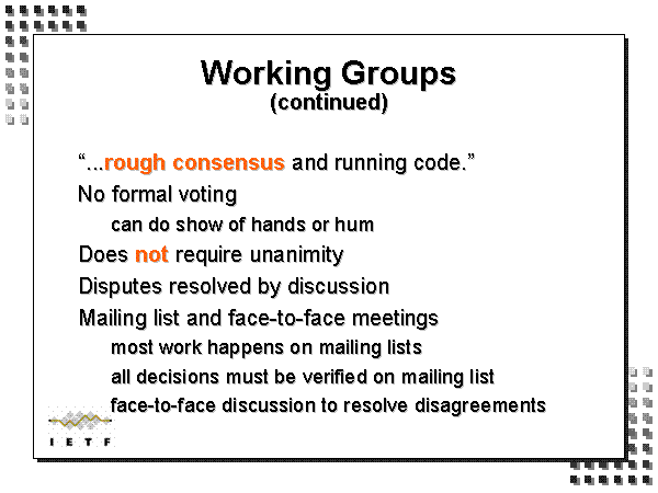 Working Groups(continued) “...rough consensus and running code.” No formal voting can do show of hands or hum Does not require unanimity Disputes resolved by discussion Mailing list and face-to-face meetings most work happens on mailing lists all decisions must be verified on mailing list face-to-face discussion to resolve disagreements |