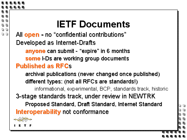 IETF Documents All open - no “confidential contributions” Developed as Internet-Drafts anyone can submit - “expire” in 6 months some I-Ds are working group documents Published as RFCs archival publications (never changed once published) different types: (not all RFCs are standards!) informational, experimental, BCP, standards track, historic 3-stage standards track, under review in NEWTRK Proposed Standard, Draft Standard, Internet Standard Interoperability not conformance |