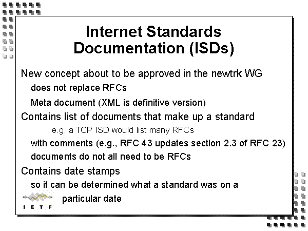 Internet Standards Documentation (ISDs) New concept about to be approved in the newtrk WG does not replace RFCs Meta document (XML is definitive version) Contains list of documents that make up a standard e.g. a TCP ISD would list many RFCs with comments (e.g., RFC 43 updates section 2.3 of RFC 23) documents do not all need to be RFCs Contains date stamps so it can be determined what a standard was on a particular date |