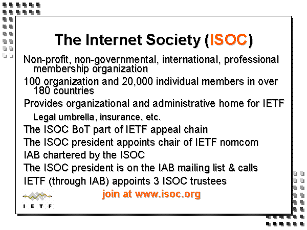 The Internet Society (ISOC) Non-profit, non-governmental, international, professional membership organization 100 organization and 20,000 individual members in over 180 countries Provides organizational and administrative home for IETF Legal umbrella, insurance, etc. The ISOC BoT part of IETF appeal chain The ISOC president appoints chair of IETF nomcom IAB chartered by the ISOC The ISOC president is on the IAB mailing list & calls IETF (through IAB) appoints 3 ISOC trustees join at www.isoc.org |
