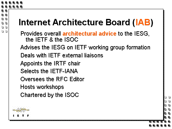 Internet Architecture Board (IAB) Provides overall architectural advice to the IESG, the IETF & the ISOC Advises the IESG on IETF working group formation Deals with IETF external liaisons Appoints the IRTF chair Selects the IETF-IANA Oversees the RFC Editor Hosts workshops Chartered by the ISOC |