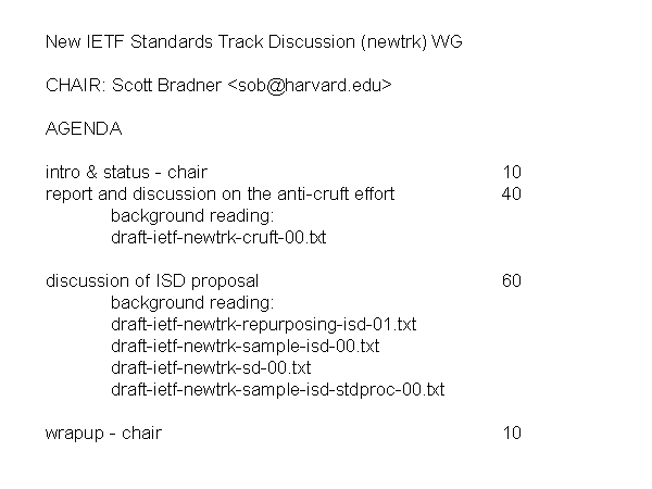 New IETF Standards Track Discussion (newtrk) WG CHAIR: Scott Bradner AGENDA intro & status - chair 10 report and discussion on the anti-cruft effort 40 background reading: draft-ietf-newtrk-cruft-00.txt discussion of ISD proposal 60 background reading: draft-ietf-newtrk-repurposing-isd-01.txt draft-ietf-newtrk-sample-isd-00.txt draft-ietf-newtrk-sd-00.txt draft-ietf-newtrk-sample-isd-stdproc-00.txt wrapup - chair 10 |