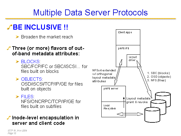 Multiple Data Server Protocols BE INCLUSIVE !! Broaden the market reach Three (or more) flavors of out-of-band metadata attributes: BLOCKS: SBC/FCP/FC or SBC/iSCSI… for files built on blocks OBJECTS: OSD/iSCSI/TCP/IP/GE for files built on objects FILES: NFS/ONCRPC/TCP/IP/GE for files built on subfiles Inode-level encapsulation in server and client code Local Filesystem pNFS server pNFS IFS Client Apps Layout driver 1. SBC (blocks)2. OSD (objects)3. NFS (files) NFSv4 extendedw/ orthogonallayout metadataattributes Layout metadatagrant & revoke |