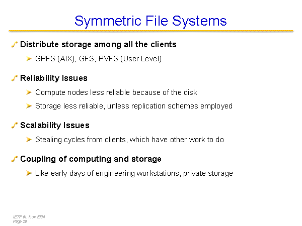 Symmetric File Systems Distribute storage among all the clients GPFS (AIX), GFS, PVFS (User Level) Reliability Issues Compute nodes less reliable because of the disk Storage less reliable, unless replication schemes employed Scalability Issues Stealing cycles from clients, which have other work to do Coupling of computing and storage Like early days of engineering workstations, private storage |
