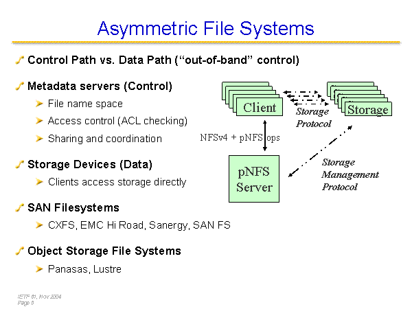 Asymmetric File Systems Control Path vs. Data Path (“out-of-band” control) Metadata servers (Control) File name space Access control (ACL checking) Sharing and coordination Storage Devices (Data) Clients access storage directly SAN Filesystems CXFS, EMC Hi Road, Sanergy, SAN FS Object Storage File Systems Panasas, Lustre Client pNFS Server Storage Storage Storage Storage Storag Storage Client Client Client Client NFSv4 + pNFS ops Storage Protocol Storage Management Protocol |