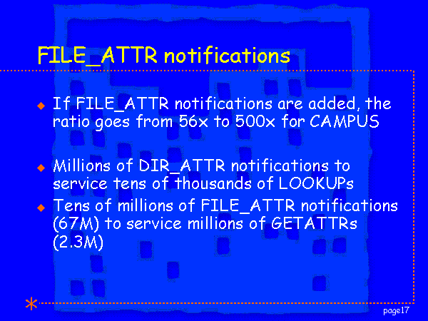 FILE_ATTR notifications If FILE_ATTR notifications are added, the ratio goes from 56x to 500x for CAMPUS Millions of DIR_ATTR notifications to service tens of thousands of LOOKUPs Tens of millions of FILE_ATTR notifications (67M) to service millions of GETATTRs (2.3M) |