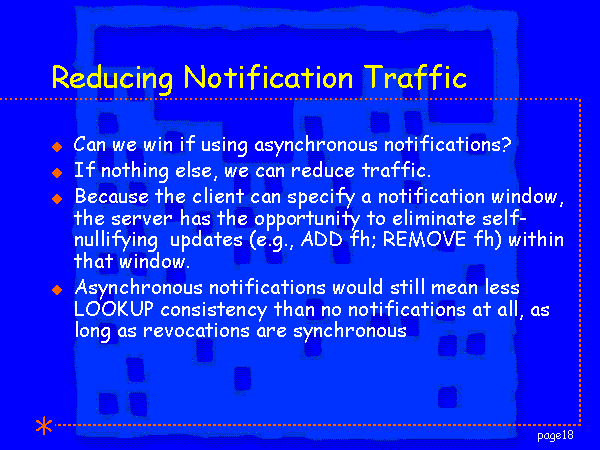 Reducing Notification Traffic Can we win if using asynchronous notifications? If nothing else, we can reduce traffic. Because the client can specify a notification window, the server has the opportunity to eliminate self-nullifying updates (e.g., ADD fh; REMOVE fh) within that window. Asynchronous notifications would still mean less LOOKUP consistency than no notifications at all, as long as revocations are synchronous |