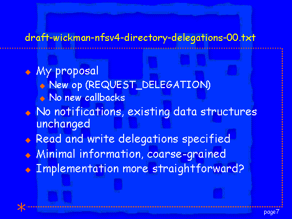 draft-wickman-nfsv4-directory-delegations-00.txt My proposal New op (REQUEST_DELEGATION) No new callbacks No notifications, existing data structures unchanged Read and write delegations specified Minimal information, coarse-grained Implementation more straightforward? |