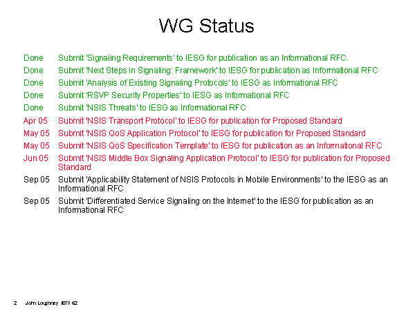 WG Status Done Submit 'Signaling Requirements' to IESG for publication as an Informational RFC. Done Submit 'Next Steps in Signaling: Framework' to IESG for publication as Informational RFC Done Submit 'Analysis of Existing Signaling Protocols' to IESG as Informational RFC Done Submit 'RSVP Security Properties' to IESG as Informational RFC Done Submit 'NSIS Threats' to IESG as Informational RFC Apr 05 Submit 'NSIS Transport Protocol' to IESG for publication for Proposed Standard May 05 Submit 'NSIS QoS Application Protocol' to IESG for publication for Proposed Standard May 05 Submit 'NSIS QoS Specification Template' to IESG for publication as an Informational RFC Jun 05 Submit 'NSIS Middle Box Signaling Application Protocol' to IESG for publication for Proposed Standard Sep 05 Submit 'Applicability Statement of NSIS Protocols in Mobile Environments' to the IESG as an Informational RFC Sep 05 Submit 'Differentiated Service Signaling on the Internet' to the IESG for publication as an Informational RFC |