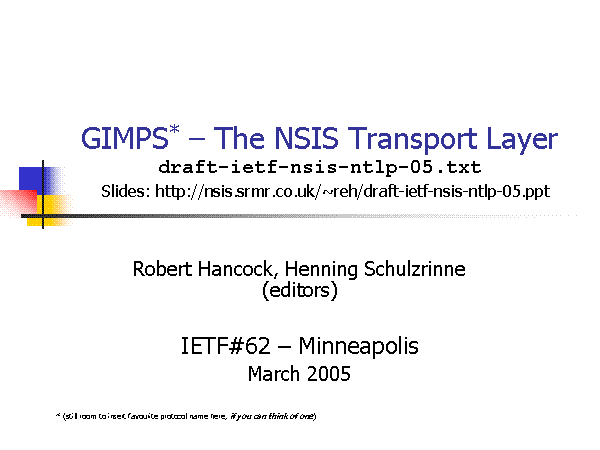 GIMPS* – The NSIS Transport Layerdraft-ietf-nsis-ntlp-05.txt Slides: http://nsis.srmr.co.uk/~reh/draft-ietf-nsis-ntlp-05.ppt Robert Hancock, Henning Schulzrinne (editors) IETF#62 – Minneapolis March 2005 * (still room to insert favourite protocol name here, if you can think of one) |
