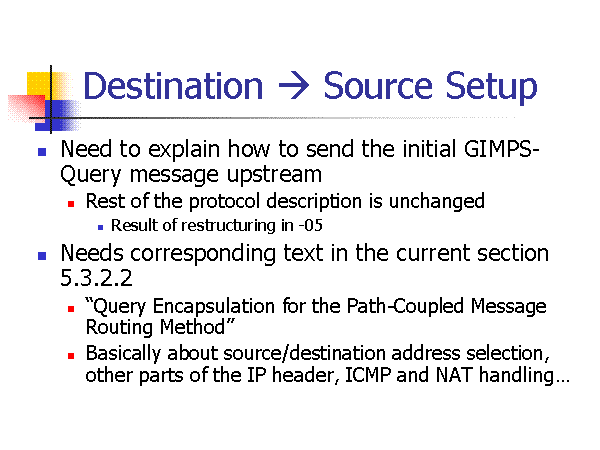 Destination ? Source Setup Need to explain how to send the initial GIMPS-Query message upstream Rest of the protocol description is unchanged Result of restructuring in -05 Needs corresponding text in the current section 5.3.2.2 “Query Encapsulation for the Path-Coupled Message Routing Method” Basically about source/destination address selection, other parts of the IP header, ICMP and NAT handling… |