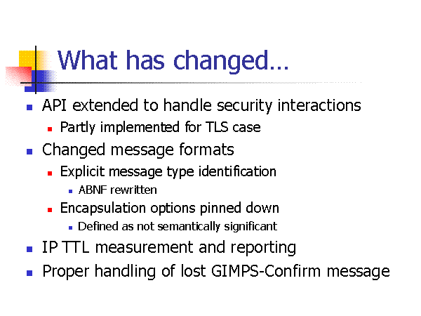 What has changed… API extended to handle security interactions Partly implemented for TLS case Changed message formats Explicit message type identification ABNF rewritten Encapsulation options pinned down Defined as not semantically significant IP TTL measurement and reporting Proper handling of lost GIMPS-Confirm message |
