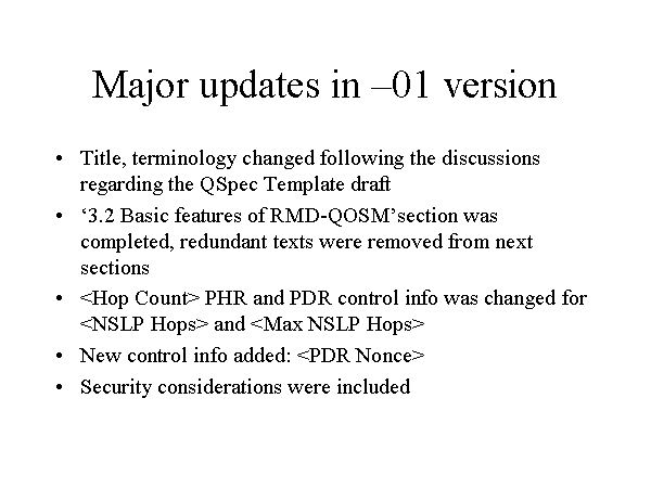 Major updates in –01 version Title, terminology changed following the discussions regarding the QSpec Template draft ‘3.2 Basic features of RMD-QOSM’section was completed, redundant texts were removed from next sections New control info added: Security considerations were included |