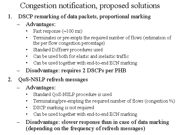 Congestion notification, proposed solutions DSCP remarking of data packets, proportional marking Advantages: Fast response (~100 ms) Terminates or pre-empts the required number of flows (estimation of the per flow congestion percentage) Standard Diffserv procedures used Can be used both for elastic and inelastic traffic Can be used together with end-to-end ECN marking Disadvantage: requires 2 DSCPs per PHB QoS-NSLP refresh messages Advantages: Standard QoS-NSLP procedure is used Terminating/pre-empting the required number of flows (congestion %) DSCP marking is not required Can be used together with end-to-end ECN marking Disadvantage: slower response than in case of data marking (depending on the frequency of refresh messages) |