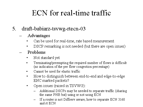 ECN for real-time traffic draft-babiarz-tsvwg-rtecn-03 Advantages Can be used for real-time, rate based measurement DSCP remarking is not needed (but there are open issues) Problems Not standard yet Terminating/preempting the required number of flows is difficult (no indication of the per flow congestion percentage) Cannot be used for elastic traffic How to distinguish between end-to-end and edge-to-edge ENC marked packets? Open issues (raised in TSVWG): Additional DSCPs may be needed to separate traffic (sharing the same PHB but) using or not using ECN If a router is not Diffserv aware, how to separate ECN 3168 and rt ECN |