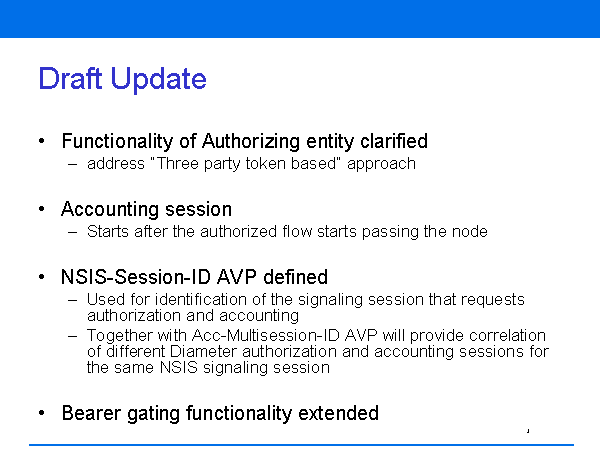 Draft Update Functionality of Authorizing entity clarified address “Three party token based” approach Accounting session Starts after the authorized flow starts passing the node NSIS-Session-ID AVP defined Used for identification of the signaling session that requests authorization and accounting Together with Acc-Multisession-ID AVP will provide correlation of different Diameter authorization and accounting sessions for the same NSIS signaling session Bearer gating functionality extended |