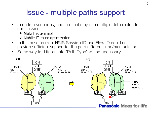 Issue - multiple paths support In certain scenarios, one terminal may use multiple data routes for one session Multi-link terminal Mobile IP route optimization In this case, current NSIS Session ID and Flow ID could not provide sufficient support for the path differentiation/manipulation Some way to differentiate “Path Type” will be necessary CN MN SID: XFlow ID: A (1) s t AR1 Nw1 Nw2 CN MN (2) s t AR2 AR1 Nw1 Nw2 AR2 QNE1 QNE1 AR3 Path1 Path2 Path3 SID: XFlow ID: B SID: XFlow ID: A Path1 Path2 SID: XFlow ID: B SID: XFlow ID: C |