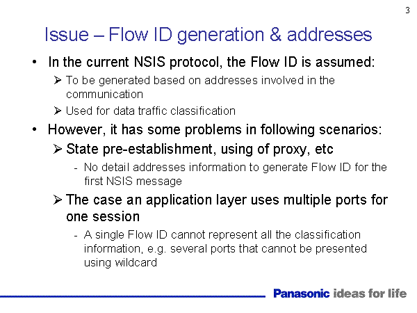 Issue – Flow ID generation & addresses In the current NSIS protocol, the Flow ID is assumed: To be generated based on addresses involved in the communication Used for data traffic classification However, it has some problems in following scenarios: State pre-establishment, using of proxy, etc No detail addresses information to generate Flow ID for the first NSIS message The case an application layer uses multiple ports for one session A single Flow ID cannot represent all the classification information, e.g. several ports that cannot be presented using wildcard |