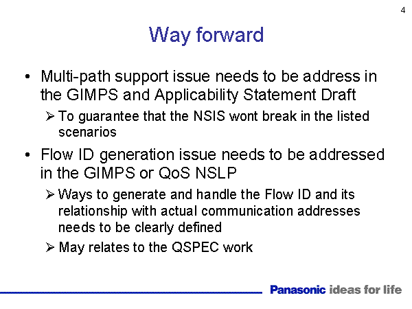 Way forward Multi-path support issue needs to be address in the GIMPS and Applicability Statement Draft To guarantee that the NSIS wont break in the listed scenarios Flow ID generation issue needs to be addressed in the GIMPS or QoS NSLP Ways to generate and handle the Flow ID and its relationship with actual communication addresses needs to be clearly defined May relates to the QSPEC work |