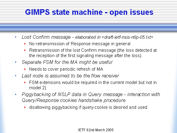 GIMPS state machine - open issues Lost Confirm message - elaborated in No retransmission of Response message in general Retransmission of the lost Confirm message (the loss detected at the reception of the first signaling message after the loss) Separate FSM for the MA might be useful Needs to cover periodic refresh of MA Last node is assumed to be the flow receiver FSM extensions would be required in the current model but not in model 2) Piggybacking of NSLP data in Query message - interaction with Query/Response cookies handshake procedure disallowing piggybacking if query-cookie is desired and used |