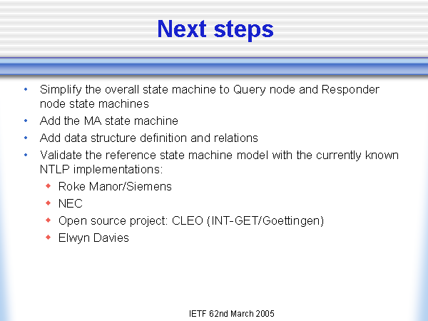 Next steps Simplify the overall state machine to Query node and Responder node state machines Add the MA state machine Add data structure definition and relations Validate the reference state machine model with the currently known NTLP implementations: Roke Manor/Siemens NEC Open source project: CLEO (INT-GET/Goettingen) Elwyn Davies |