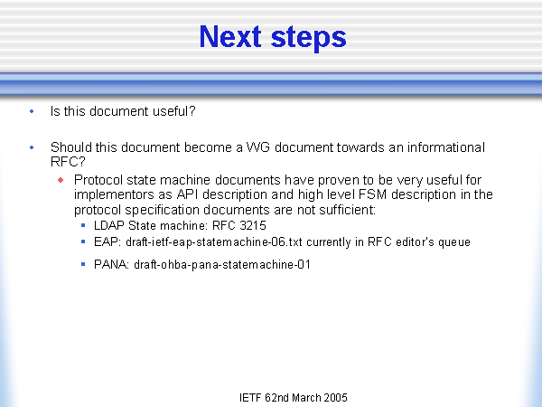 Next steps Is this document useful? Should this document become a WG document towards an informational RFC? Protocol state machine documents have proven to be very useful for implementors as API description and high level FSM description in the protocol specification documents are not sufficient: LDAP State machine: RFC 3215 EAP: draft-ietf-eap-statemachine-06.txt currently in RFC editor’s queue PANA: draft-ohba-pana-statemachine-01 |