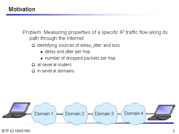 Motivation Problem: Measuring properties of a specific IP traffic flow along its path through the Internet identifying sources of delay, jitter and loss delay and jitter per hop number of dropped packets per hop at several routers in several domains Domain 1 Domain 2 Domain 3 Domain 4 |
