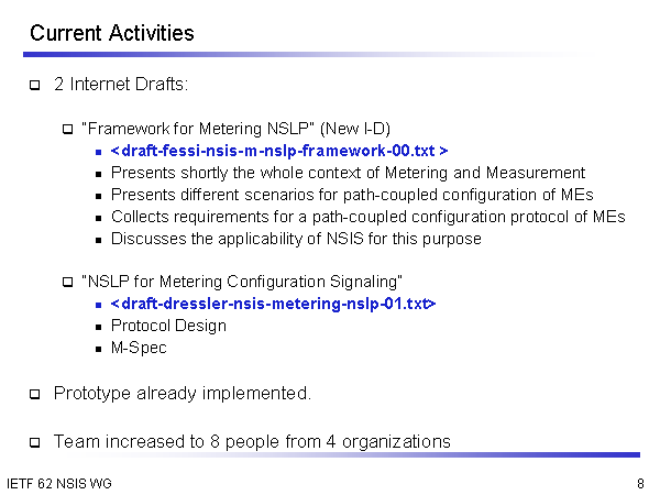Current Activities 2 Internet Drafts: “Framework for Metering NSLP” (New I-D) Presents shortly the whole context of Metering and Measurement Presents different scenarios for path-coupled configuration of MEs Collects requirements for a path-coupled configuration protocol of MEs Discusses the applicability of NSIS for this purpose “NSLP for Metering Configuration Signaling” Protocol Design M-Spec Prototype already implemented. Team increased to 8 people from 4 organizations |