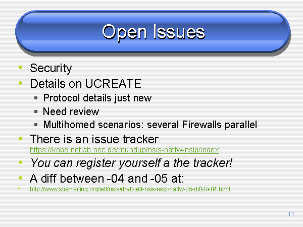 Open Issues Security Details on UCREATE Protocol details just new Need review Multihomed scenarios: several Firewalls parallel There is an issue trackerhttps://kobe.netlab.nec.de/roundup/nsis-natfw-nslp/index You can register yourself a the tracker! A diff between -04 and -05 at: http://www.stiemerling.org/ietf/nsis/draft-ietf-nsis-nslp-natfw-05-diff-to-04.html |
